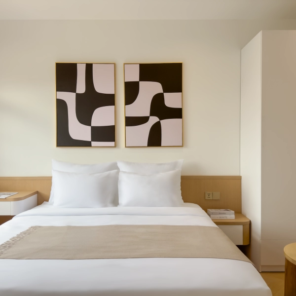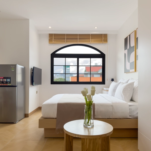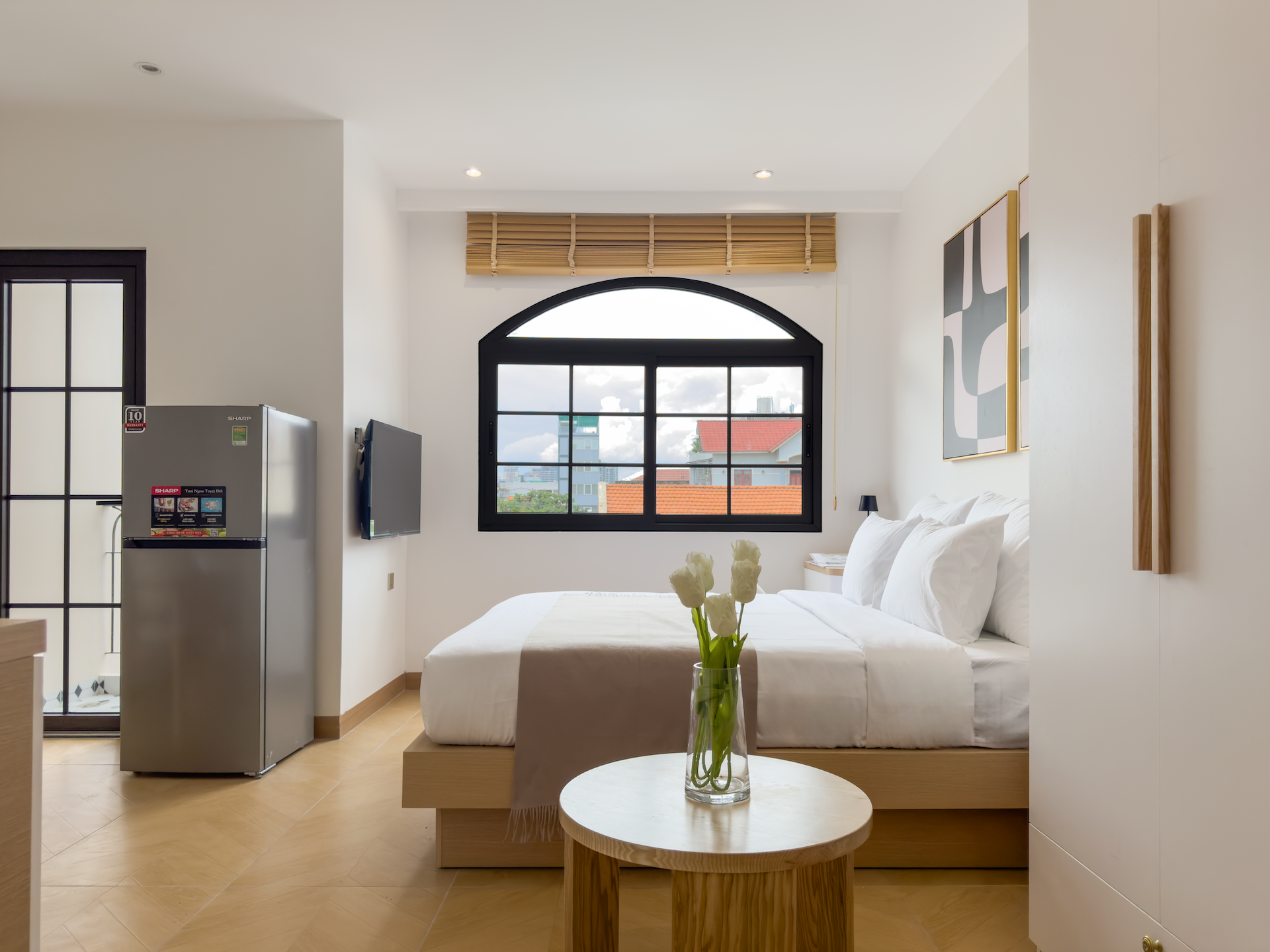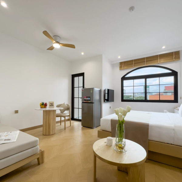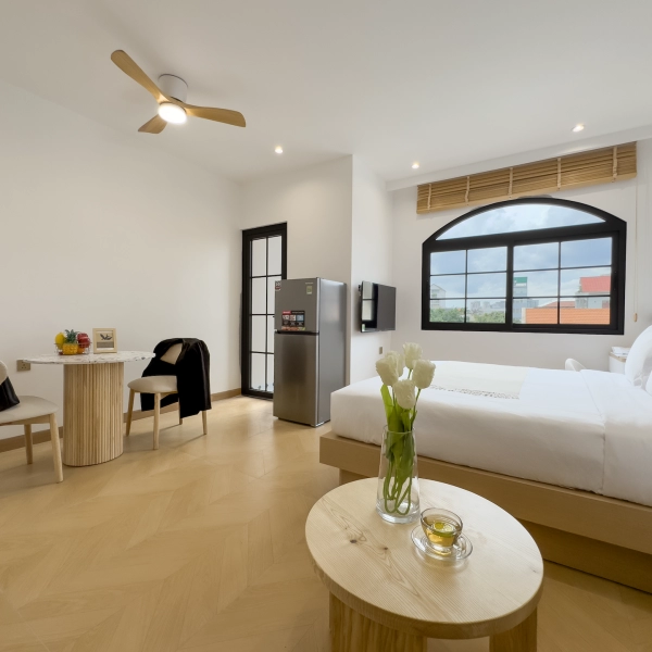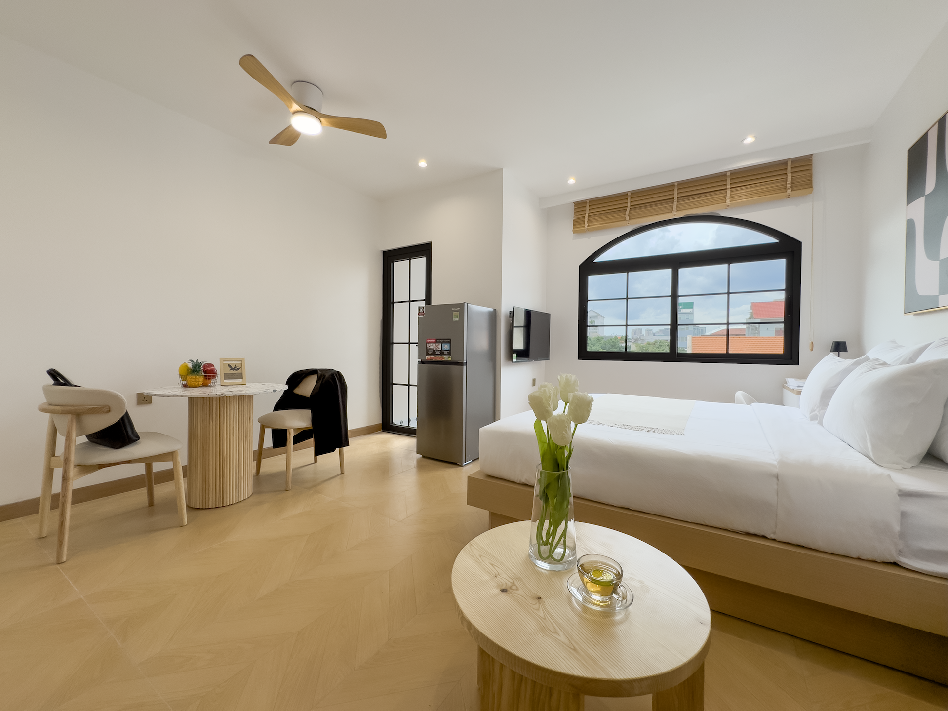 - Tiện nghi tinh tế: Tận hưởng sự thư giãn từ những đường nét bo tròn mềm mại và hệ rèm sáo gỗ kiểm soát ánh sáng sắc nét.