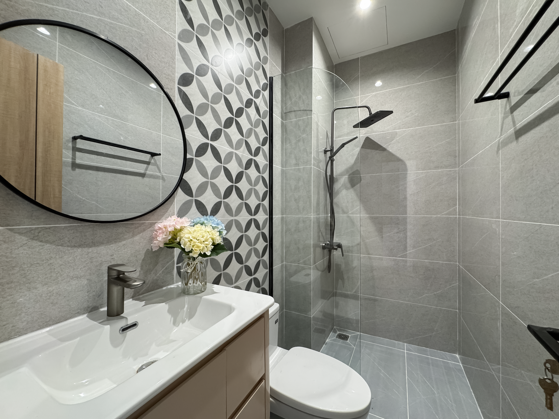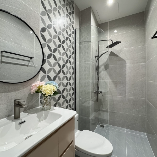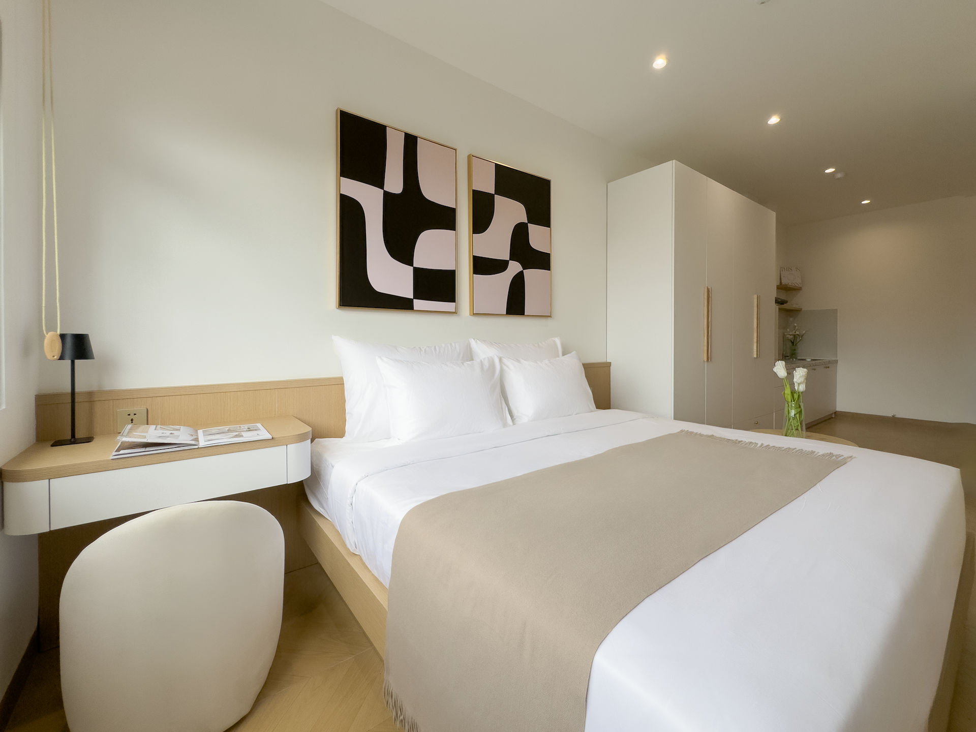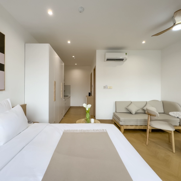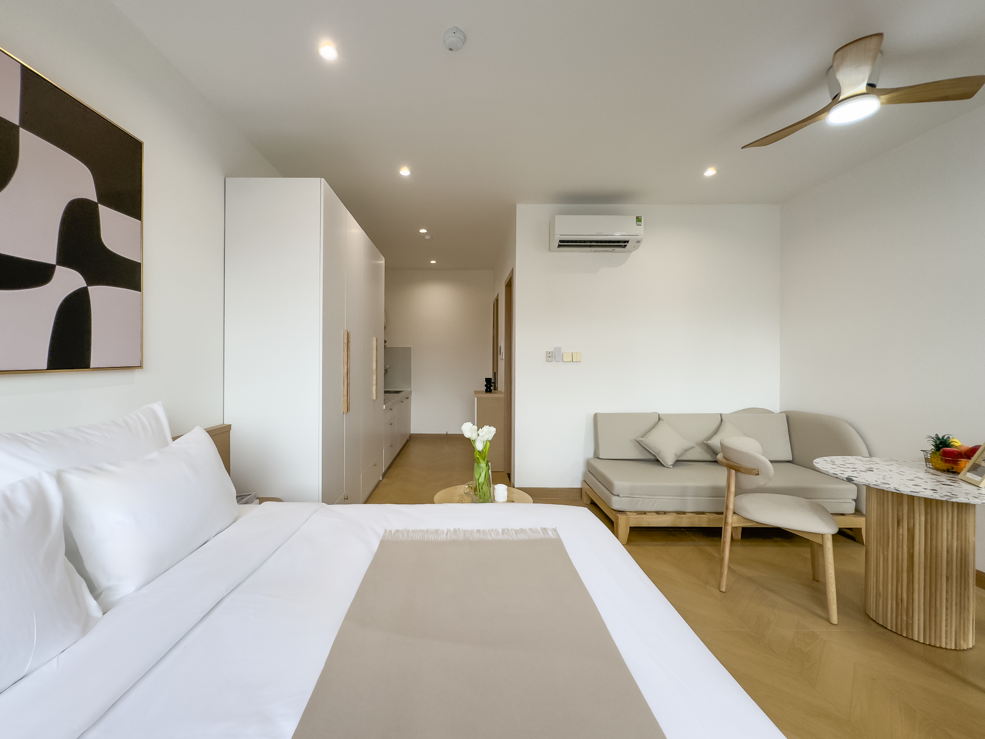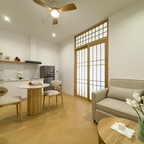 - Thiết kế Japandi: Không gian sáng thoáng với tông màu trắng chủ đạo và nội thất gỗ sồi (Oak) cao cấp.