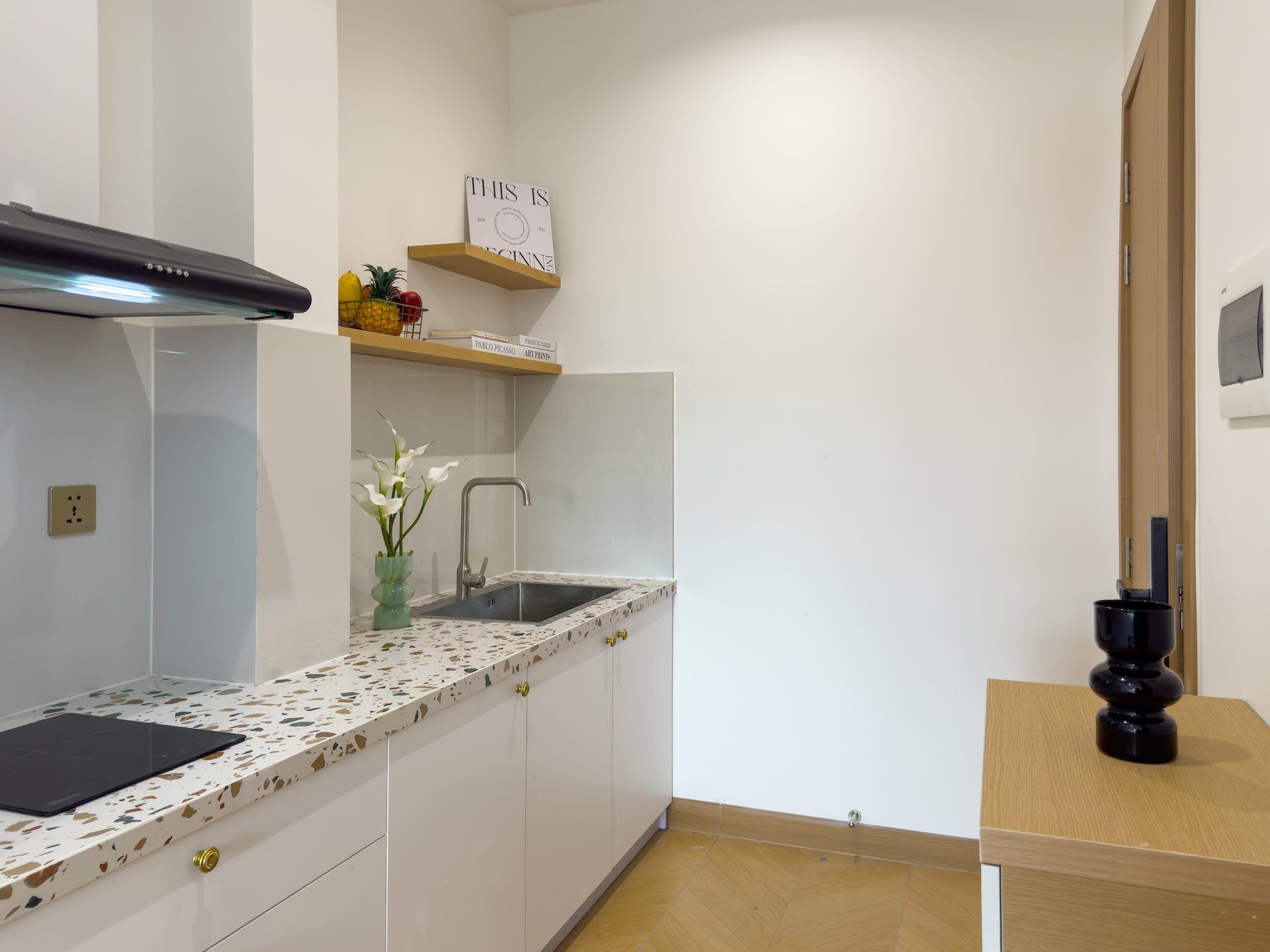 - Điểm nhấn nội thất: Sàn gỗ lát xương cá (Herringbone) sang trọng, mặt bếp đá mài Terrazzo nghệ thuật và vách ngăn Shoji cách tân tối ưu ánh sáng.