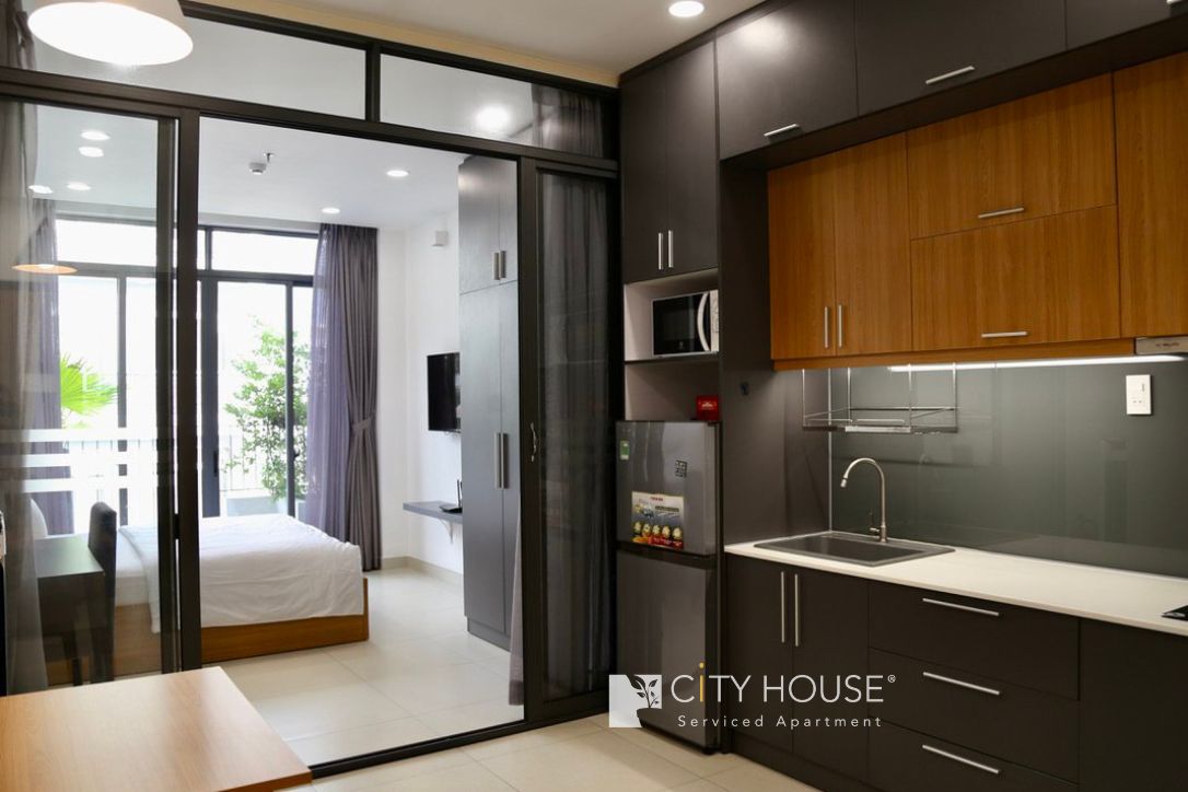 Một trong những điểm nổi bật của căn hộ là khu bếp được trang bị hoàn chỉnh với tất cả các thiết bị cần thiết như bếp điện, lò vi sóng và đặc biệt là tủ lạnh lớn.